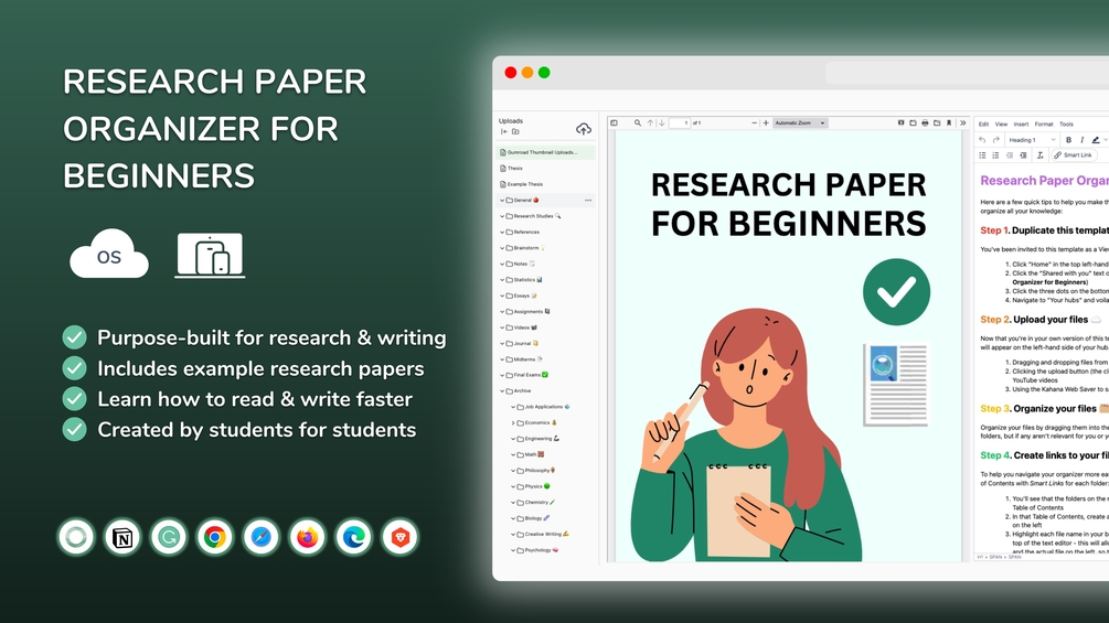 Say farewell to writer's block! Starting with this template is the easiest way to organize references, citations, sources, and drafts for a research paper, dissertation, or thesis. Created by two former Duke engineering students and serial researchers (two nerdy information junkies π€)