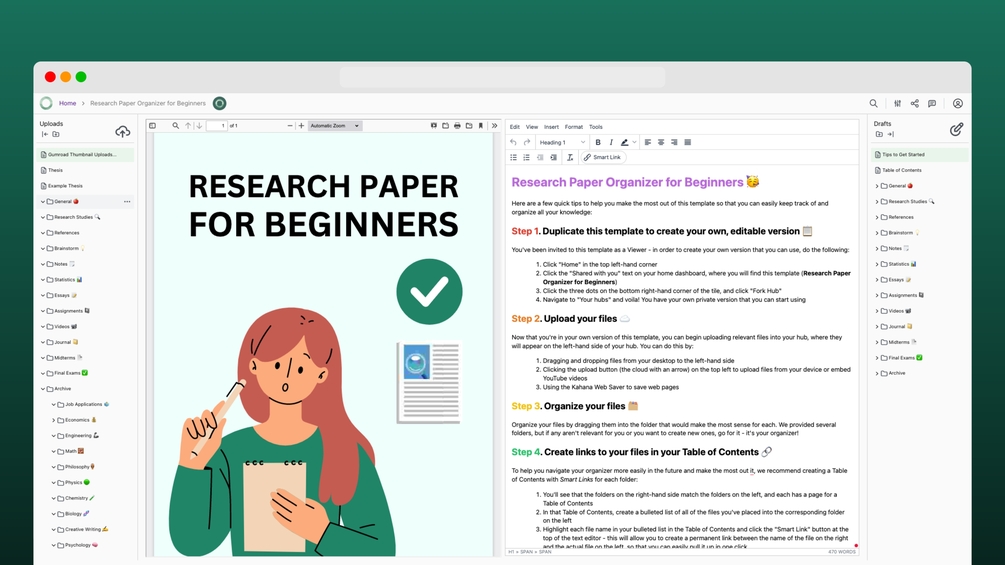 Say farewell to writer's block! Starting with this template is the easiest way to organize references, citations, sources, and drafts for a research paper, dissertation, or thesis. Created by two former Duke engineering students and serial researchers (two nerdy information junkies π€)